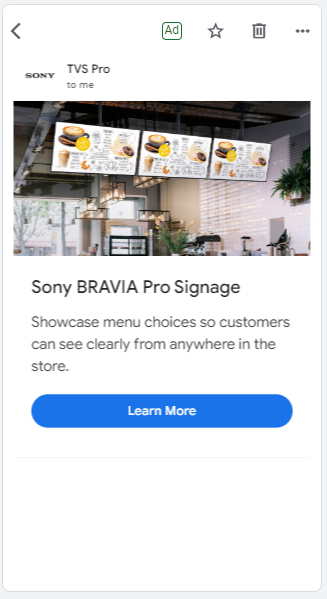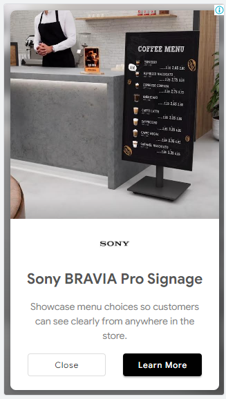 In 2023, I developed a co-op campaign with Sony under the TVS Pro brand, promoting Sony’s Professional BRAVIA Displays for use in digital signage within restaurants and the food industry. The ads ran on the Google Display Network and featured two distinct visual styles that shared the same headline to test audience response and engagement.
