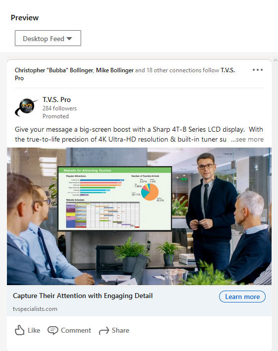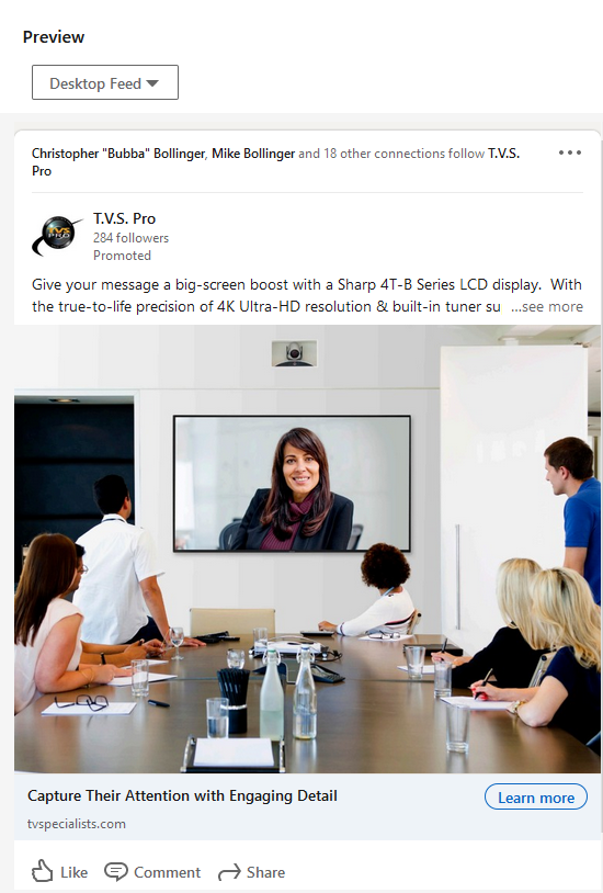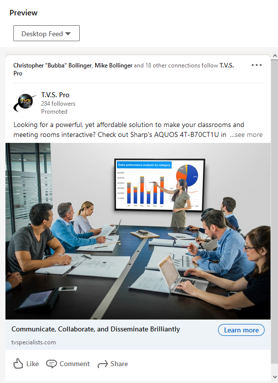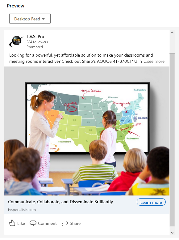 In 2021, I designed a LinkedIn advertising campaign for Sharp’s AQUOS Interactive Displays, executed as a co-op initiative with TVS Pro. The campaign included four ads—two highlighting the interactive collaboration features and two emphasizing their use as versatile displays for meetings and presentations. A dedicated landing page with a contact form complemented the ads, creating a seamless lead-generation experience and maintaining a consistent visual identity across all campaign touchpoints.